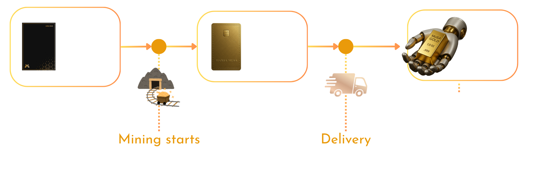 * पूर्ण भुगतान प्राप्त होने पर मूसा गोल्ड, प्लेटफ़ॉर्म पर क्रेता के बैक ऑफिस के माध्यम से सभी प्रभावित खरीदारों को इस प्रारंभिक उत्पादन तिथि की सूचना देगा।